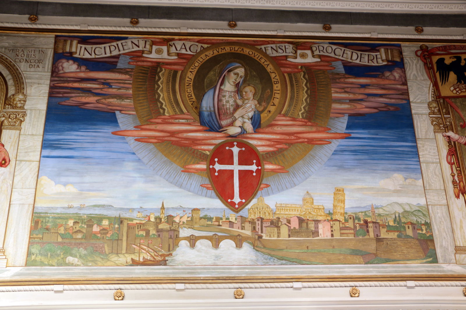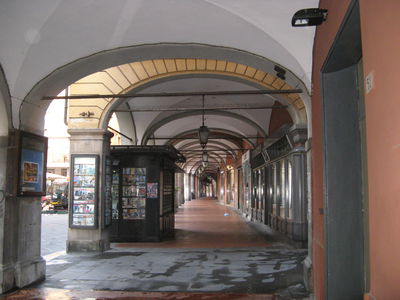 Then you're off again back in time as you navigate north on Corso Italia, the main shopping street in Pisa but that was built along a Roman road. A look at the buildings around us, as Davide recommends, sees us seeing more than just the stores at street level. Buildings were rebuilt in Gothic style, there are medieval facades (fake since they don't go back that far), more "modern" Renaissance buildings. One such one, the Palazzo dei Vicenti, houses an H&M store as well as a gem: murals inside one of the stores, with clothes below and a view of Pisa of the past on its walls. We surely would never have ventured inside on our own or known about the palace's history.