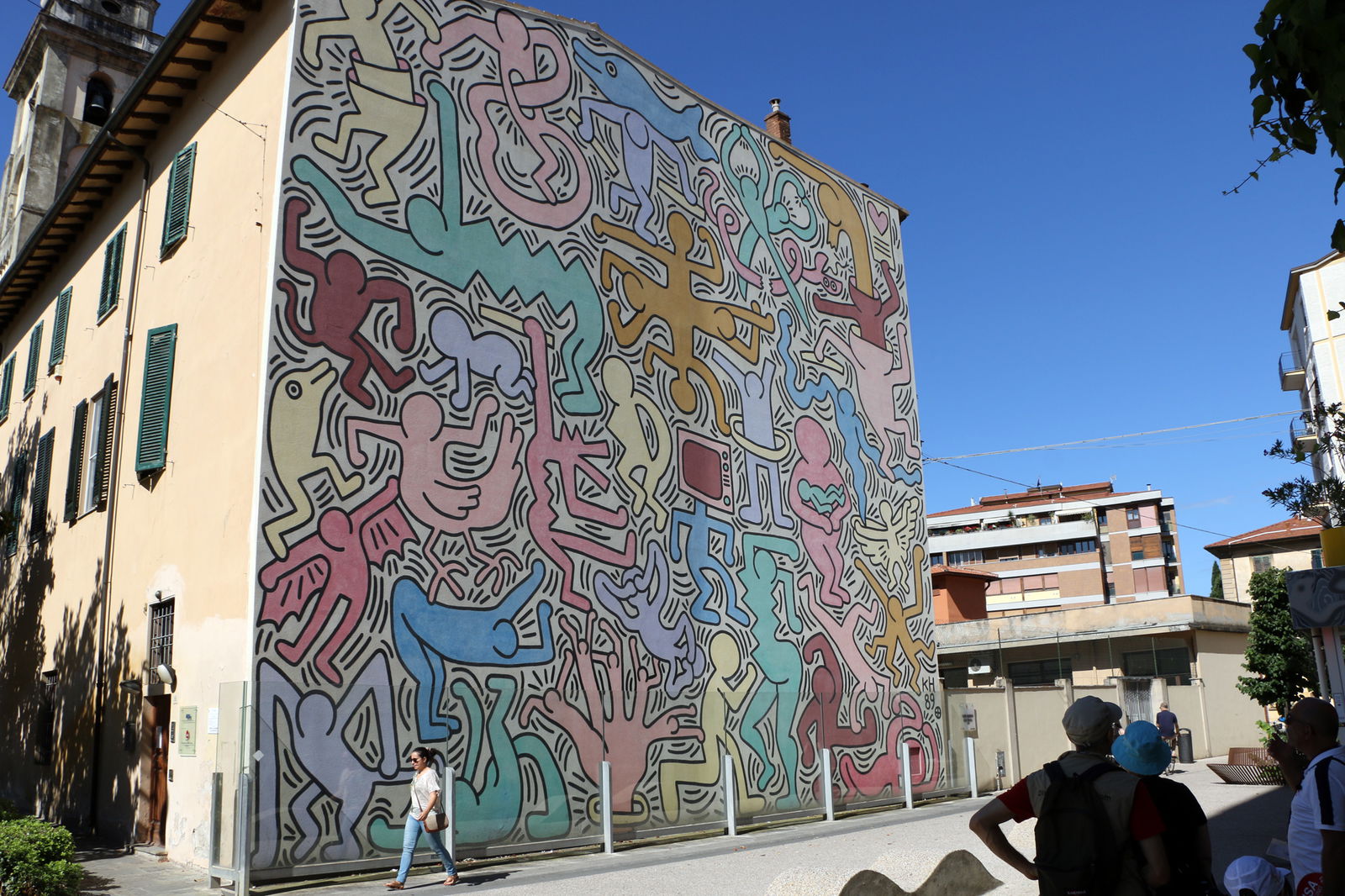 You will quickly be brought to more modern times as the area around the train station is relatively "new": Pisa was heavily bombed during World War II so most of this area has been reconstructed. In addition to this, not far from the station, on the side of a building on a street you would not ever go down, you will find a modern attraction: a huge mural by the late, 20th-century American artist Keith Haring. The largest mural and the only one to be intended as a permanent mural by Haring himself, the colorful jigsaw-like design of brightly painted figures invite you to stop and appreciate the theme of peace and harmony in the world in this piece entitled "Tuttomondo" ("Allworld"), created in 1989 a few months before his death in 1990 and therefore his last public work.