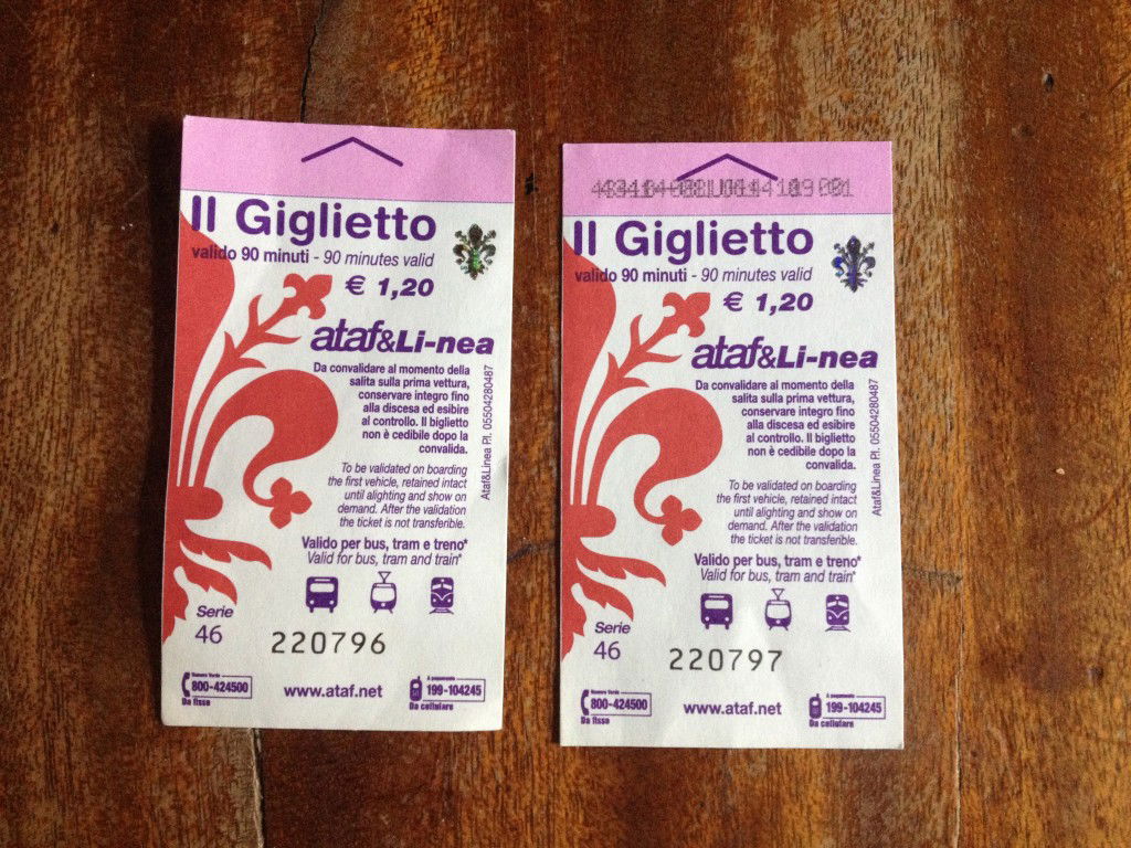 Buying bus or train tickets is not enough, as they are "open-ended" (no date on them) and not for a specific bus or train (valid for all buses or regional trains, for example). So before getting on the train or as soon as you get on the bus, you MUST "validate" the ticket by putting them in the small machines that stamp your ticket with date and time. The tickets above show bus tickets in Florence, the left one without the validation, the right one already validated (ticket price has gone up since this photo was taken to €1,50).